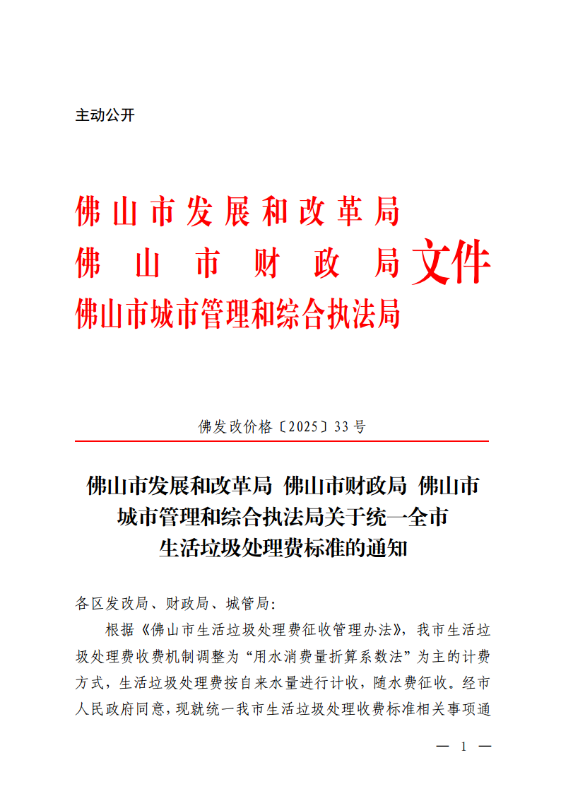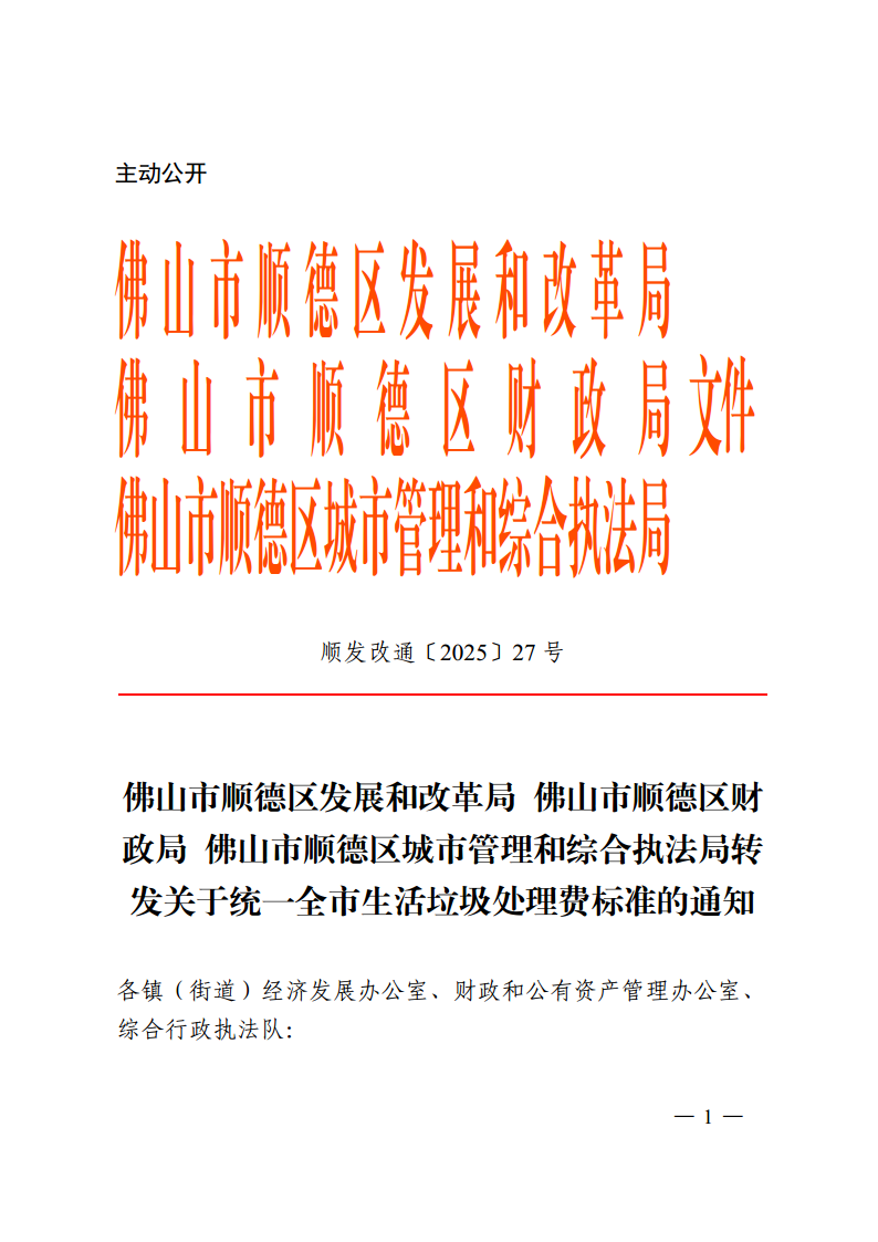 佛山市顺德区发展和改革局 佛山市顺德区财政局 佛山市顺德区城市管理和综合执法局转发关于统一全市生活垃圾处理费标准的通知(顺发改通〔2025〕27号)
